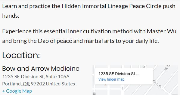 I decided to not take any pictures this time because there was a lot of information to cover for such a deceptively simple yet hard to mimic series of movements. Perhaps I will post a short video practicing to make up for the lack of visuals. This would be my third time going to a Portland workshop by Master Wu. It started and ended semi awkwardly as the first two, but this time it is becoming a little more charming. Master Wu was a little more lively this time around as the first two workshops where of a qigong / meditation flavor. I got to touch hands with a lot of people. Master Wu’s demonstrations was cool to see as he showed how he can react to physical forces and apply force on to others. I did touch hands with Master Wu, but did not have the opportunity to experience any energetic force.